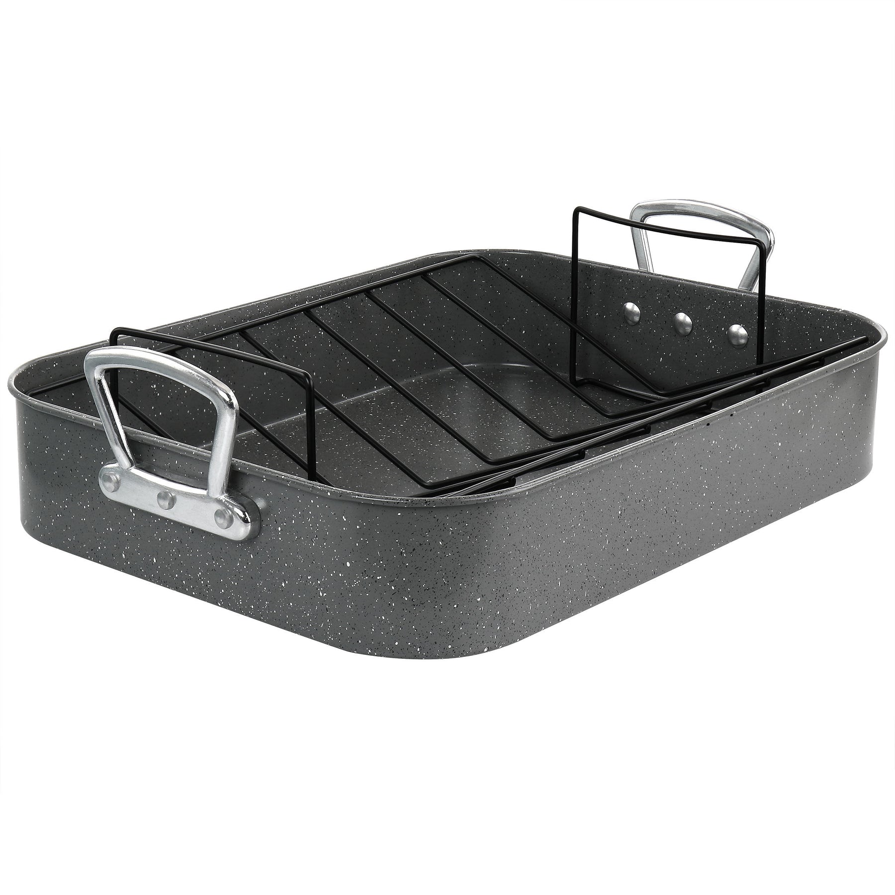 The 2-piece turkey roster set by Gibson is the perfect solution for holiday and special occasion meals. This large 16.25in pan will fit turkeys, chickens, and large one pan meals. The lightweight carbon steel construction makes this pan and wire rack combination easy to move from counter to oven to table. Wire rack leaves room for meat juices to flow to the bottom while keeping your meat cooking evenly and achieving that perfect crisp from top to bottom. Large stainless steel integrated handles for a sturdy grip. Speckled grey pan design.
