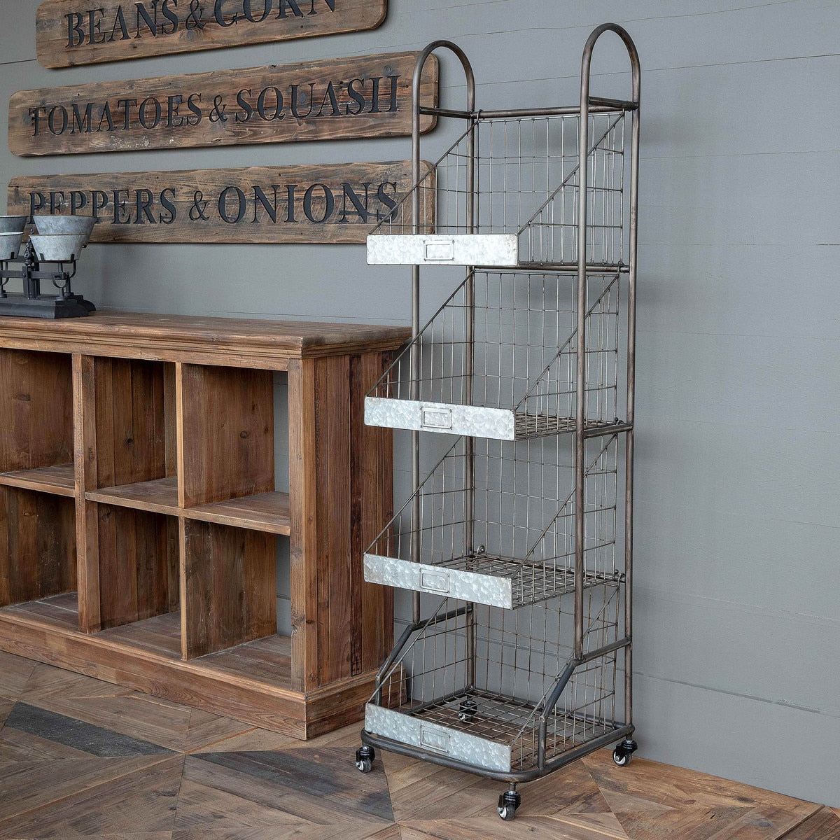 Inspired by vintage grocery racks, this metal bread rack is perfect for storing and displaying a wide variety of items. Casters make this piece ideal for multi-functional use.
