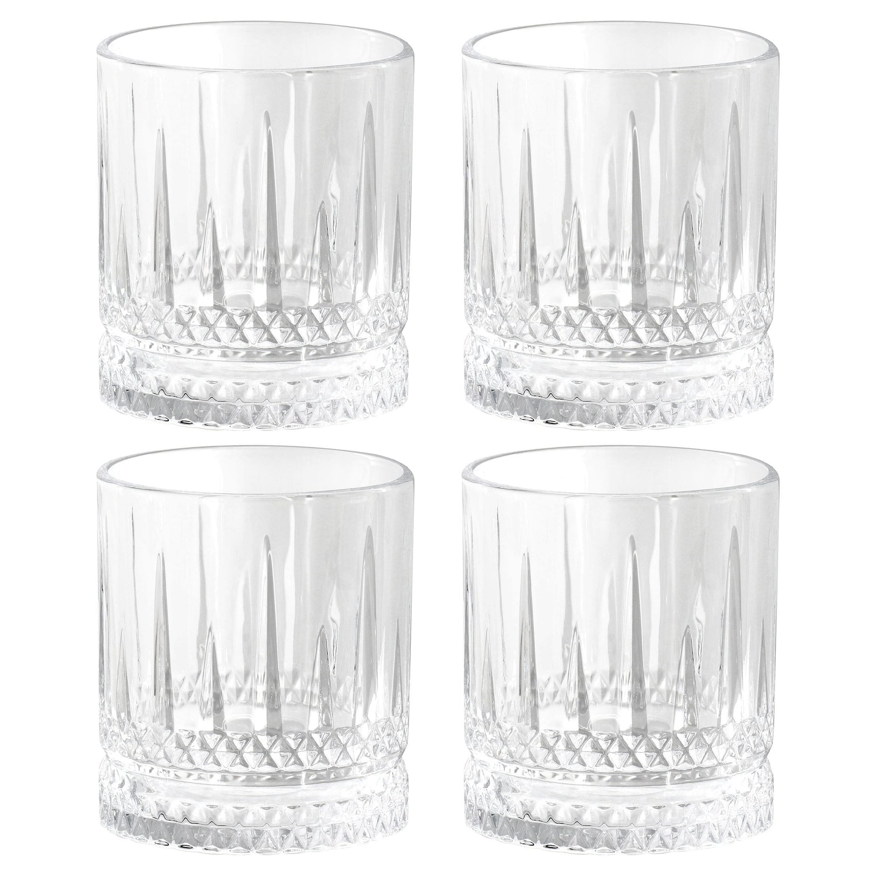 This four 13 Ounce drinkware set is designed with a diamond shaped embossed exterior that sparkles with brilliance and clarity. Perfect for serving iced teas, cocktails, or any beverage of your choice, each piece complements any style of table setting. Whether you are celebrating with friends or enjoying a casual drink, this set will add a special touch to the occasion. Durable glass construction is dishwasher safe for easy cleanup.