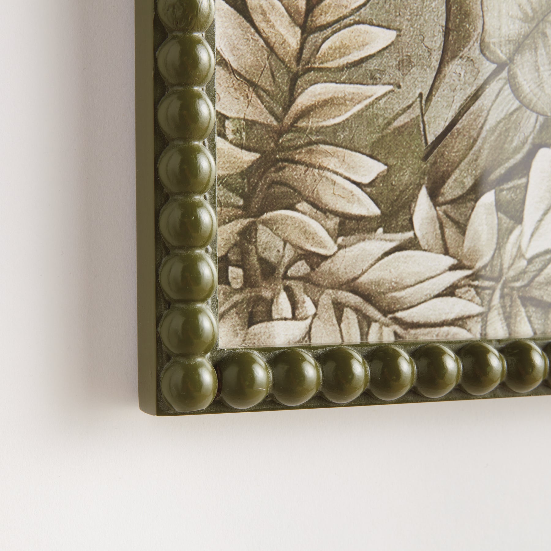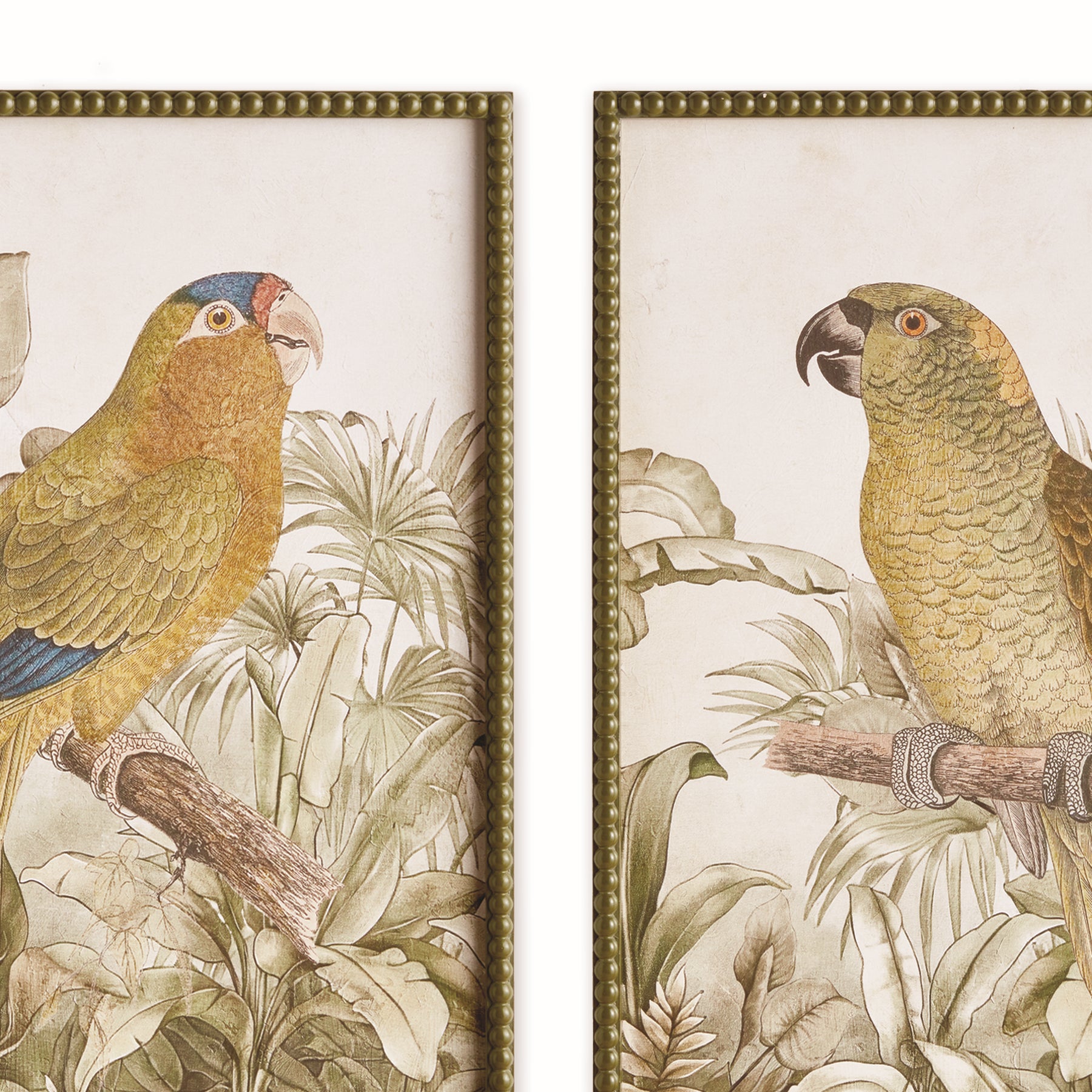 These tropical parrot prints with intricate backgrounds are a pop of color for any space from bedroom to foyer. In a classic British Colonial style, and finished off with a striking olive-green frame, this set of two are made for the traditional beach cottage or any coastal-inspired setting.