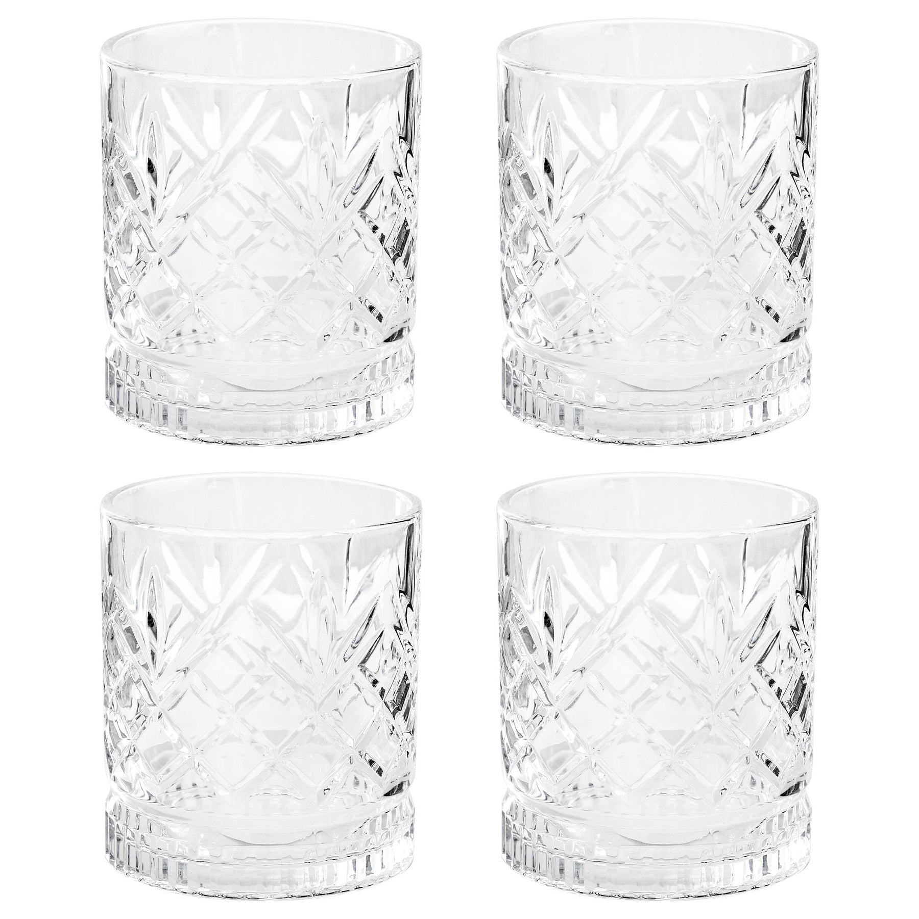 This four 13 Ounce drinkware set is designed with a diamond shaped embossed exterior that sparkles with brilliance and clarity. Perfect for serving iced teas, cocktails, or any beverage of your choice, each piece complements any style of table setting. Whether you are celebrating with friends or enjoying a casual drink, this set will add a special touch to the occasion. Durable glass construction is dishwasher safe for easy cleanup.