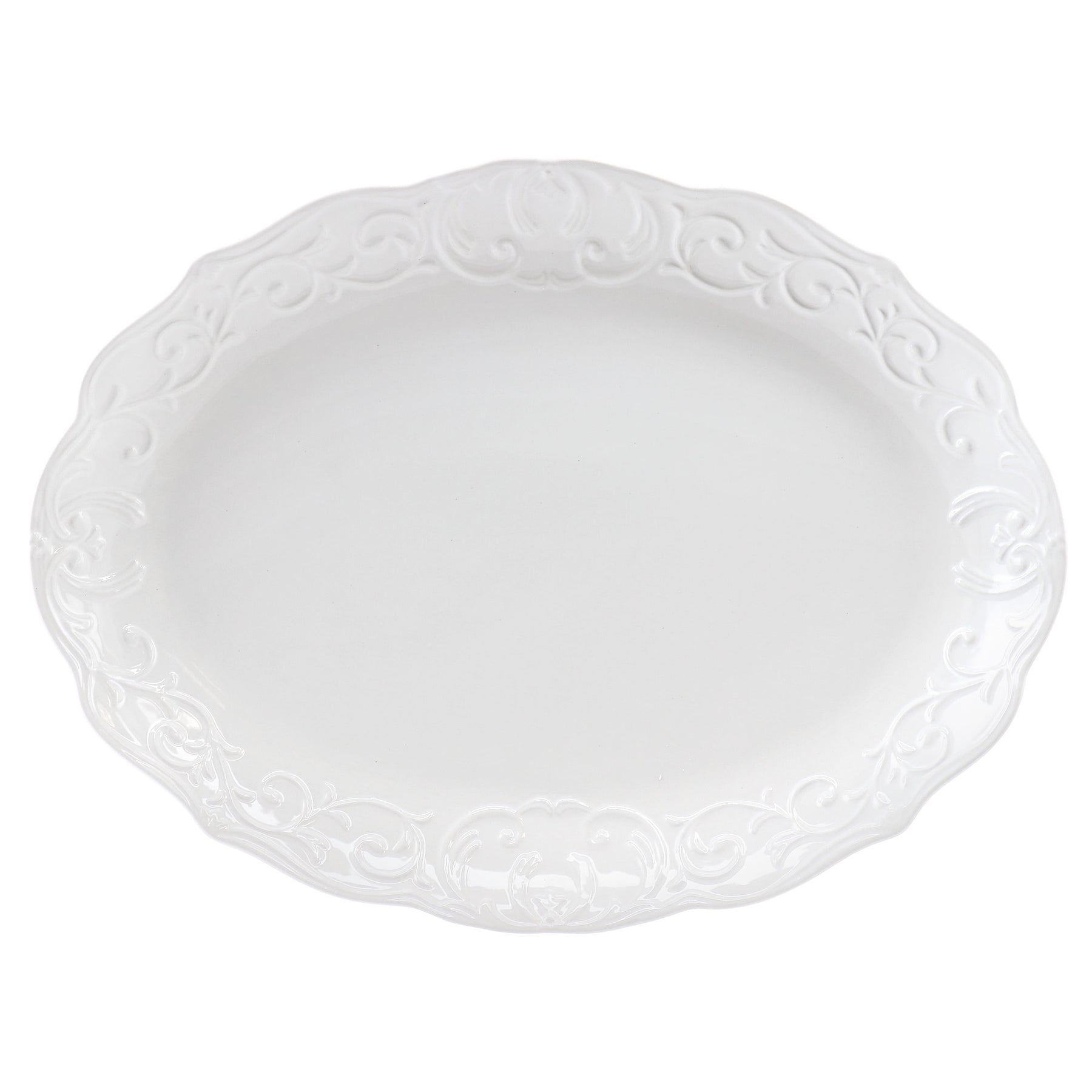 No major dinner gathering is complete without the Gibson Home Bountiful Joy Durastone Oval Platter placed at the center of the table. Its lavish 18.75 x 14 inch size is perfect for any extravagant main dish. The rim is decorated with a Versailles style embossed pattern. The white gloss finish helps exaggerate any colorful meal to draw guests in. The strong durastone material allows for the platter to be dishwasher safe and microwave safe for better everyday convenience. Serve a variety of meals, from a savory lechon, to a large display of juicy steaks!