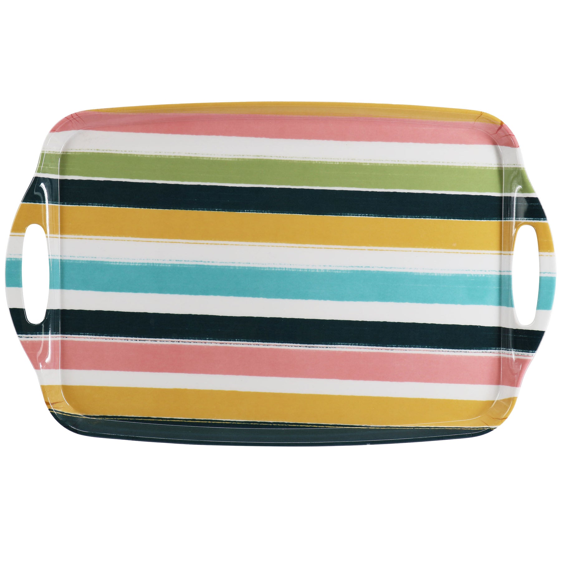 Serve your guests some color and fun with this Tropical Sway melamine 19in serving tray. Constructed of melamine that is shatter proof, making it perfect for both indoor and outdoor dining. Serve up appetizers, fresh fruits and veggies, main dishes, and more on this sturdy but lightweight tray. Handles and raised sides make mobility a breeze while the fun and colorful bold stripe pattern is perfect for summer BBQs or spring picnics. Keep the color in what you're serving with this versatile tray!