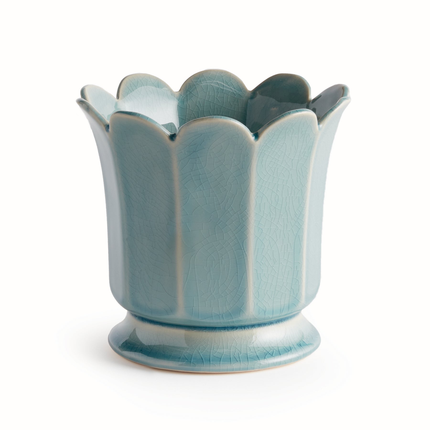 In a classic silhouette with petal edges, this footed pot is nature-inspired. Finished in a soft sage reactive glaze, it is a great way to add a touch of color to any space.