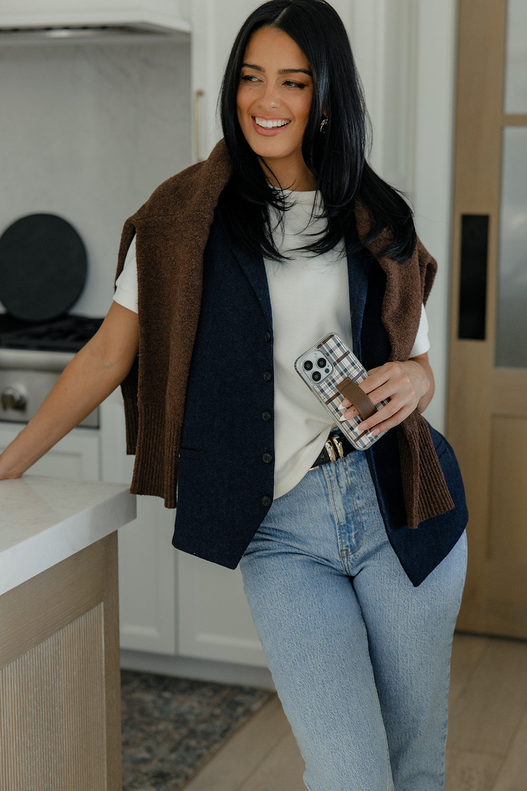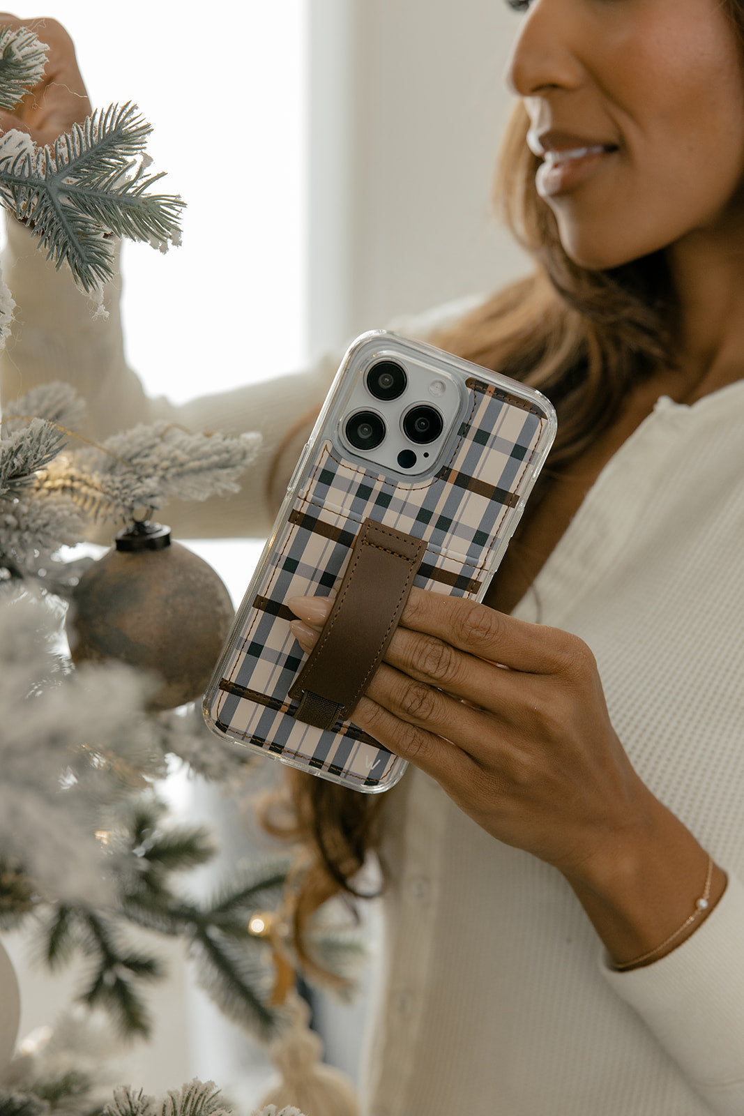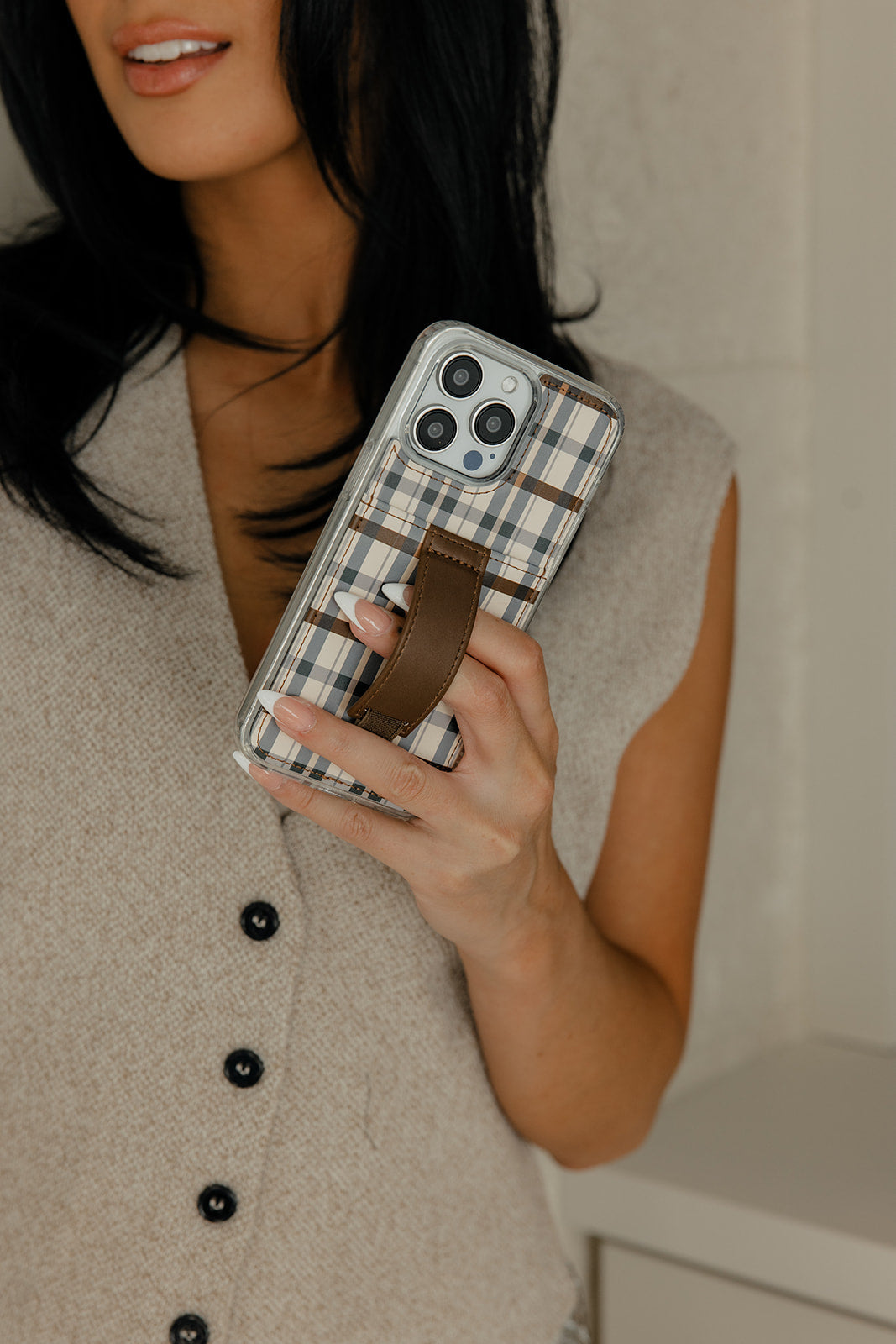 Case Design: Navy and brown plaid on a cream background
