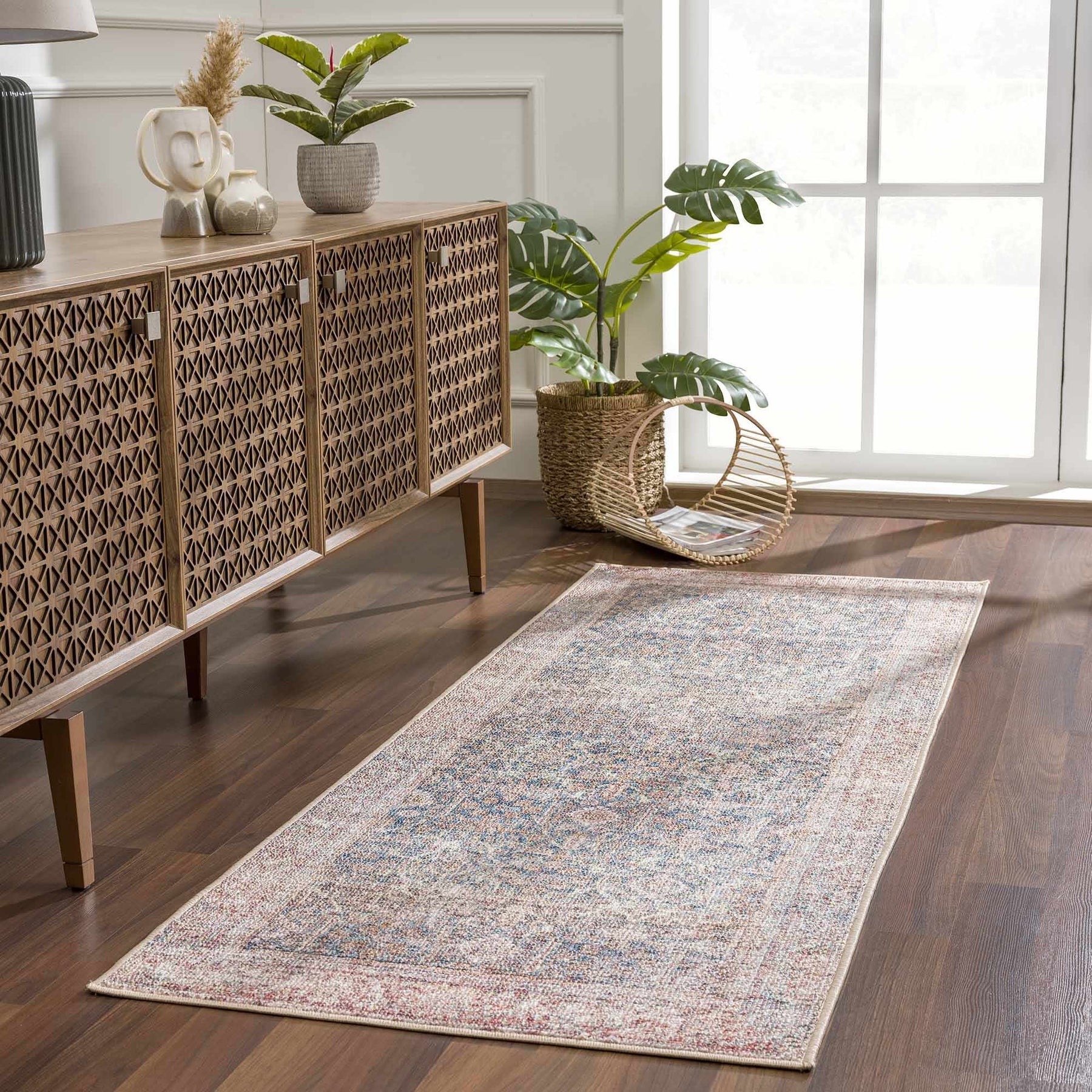 About: Discover the timeless elegance of this traditional-style area rug. Washable for convenience, it features a beautiful bordered design with intricate interlocking shapes. Ideal for adding a classic touch to any room, this rug combines historical charm with modern practicality, enhancing your home with its artistic and durable design. |