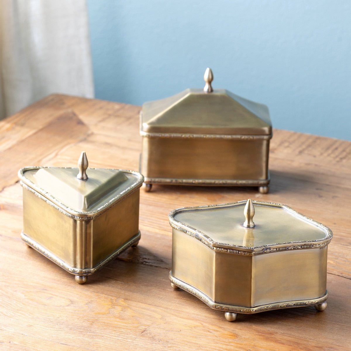 Inspired from antique brass desk boxes, our 100% brass escritoire boxes come in a set of 3, rectangle, triangle and diamond. Each comes with a lid and decorative edging detail. Ball feet complete the look. Perfect for holding desk object or trinkets.