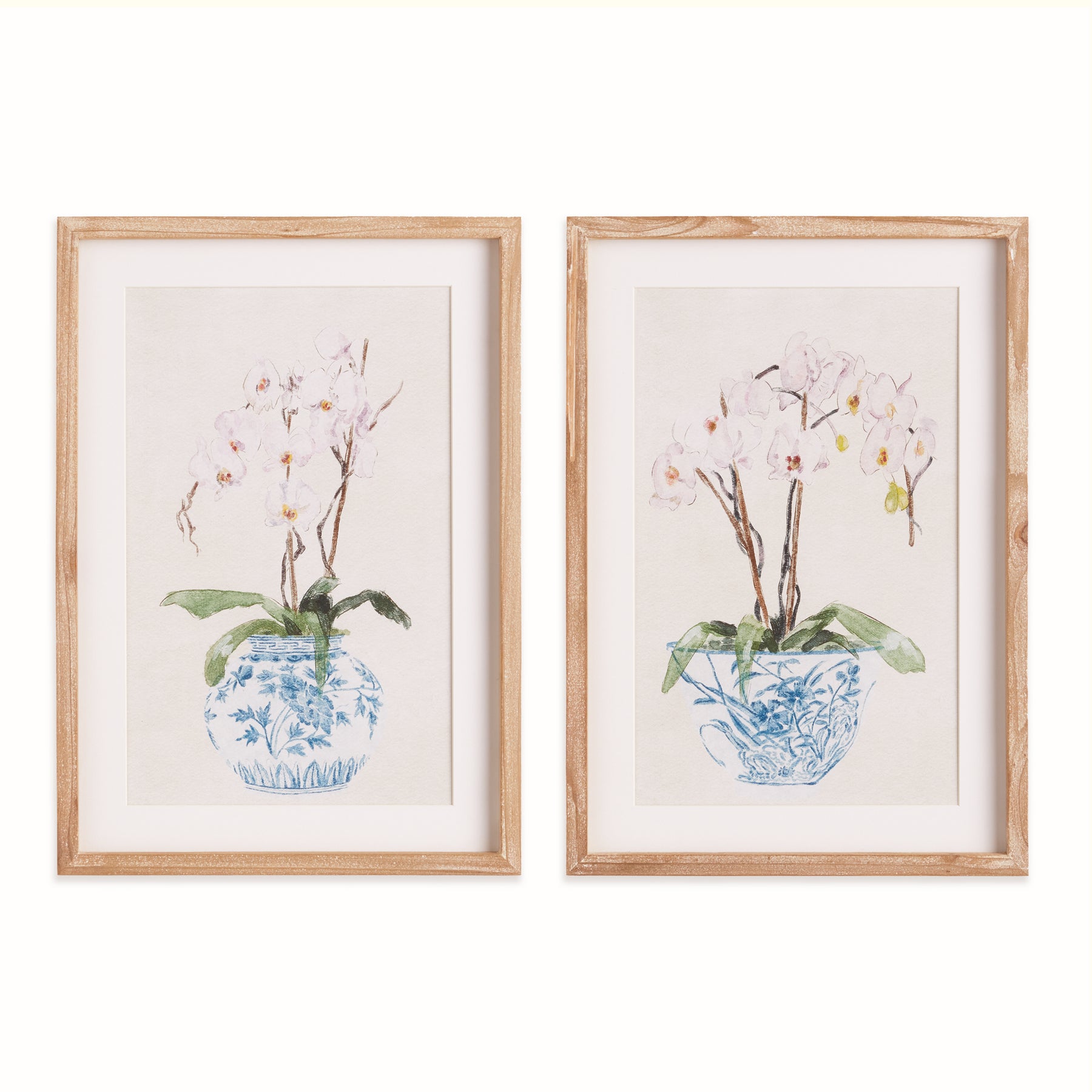 This pair of whimsical potted phalaenopsis in blue chinoiserie is a charming pair. Impressive in scale, and finished off with simple natural wood frames, they are a lovely set for bedroom, study or guest bath.