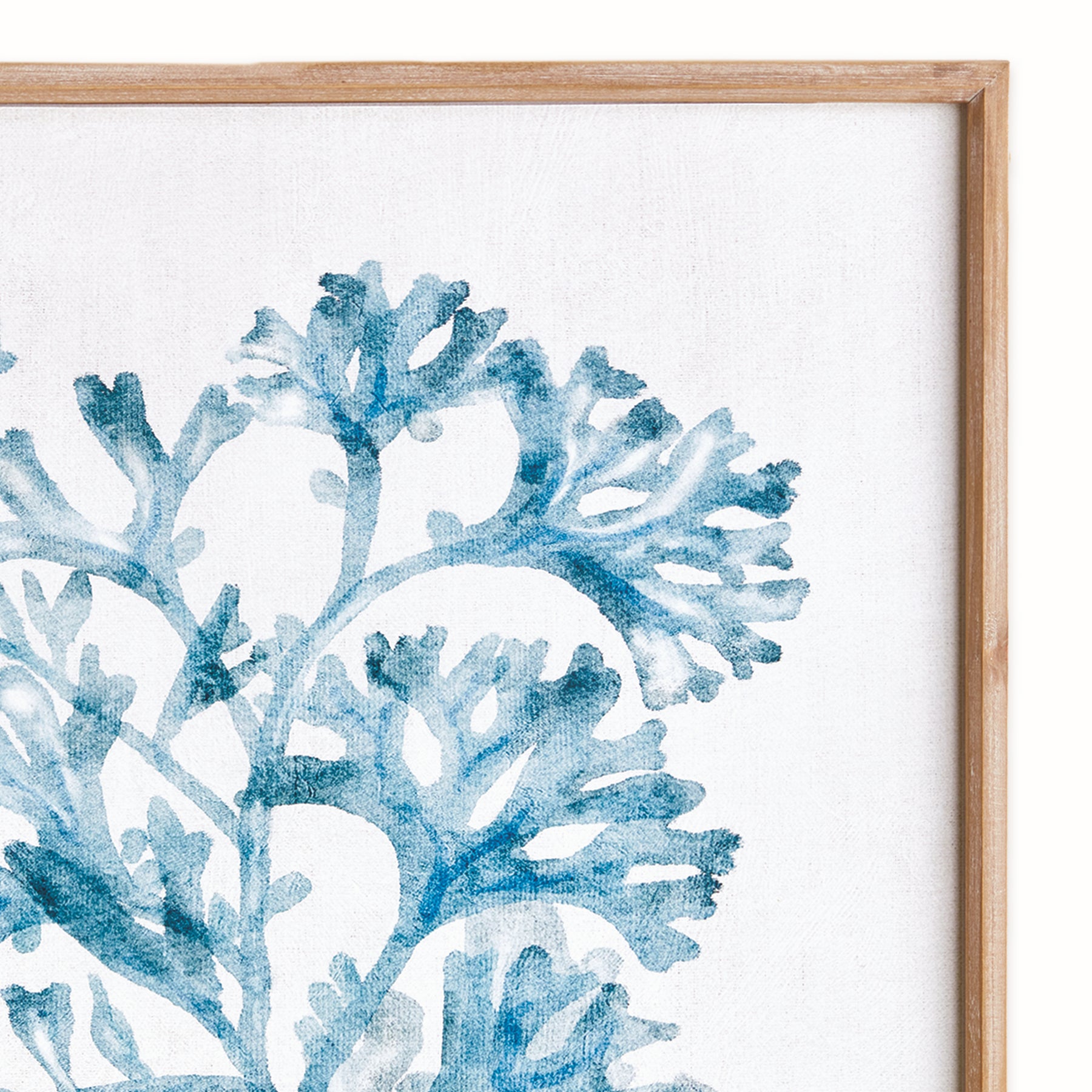 As elegant in style as it is in scale, this serene monochromatic blue coral framed print is signature upscale coastal chic. The soft, watercolor design and natural fir wood frame makes it ideal for home office, bedroom or living space.