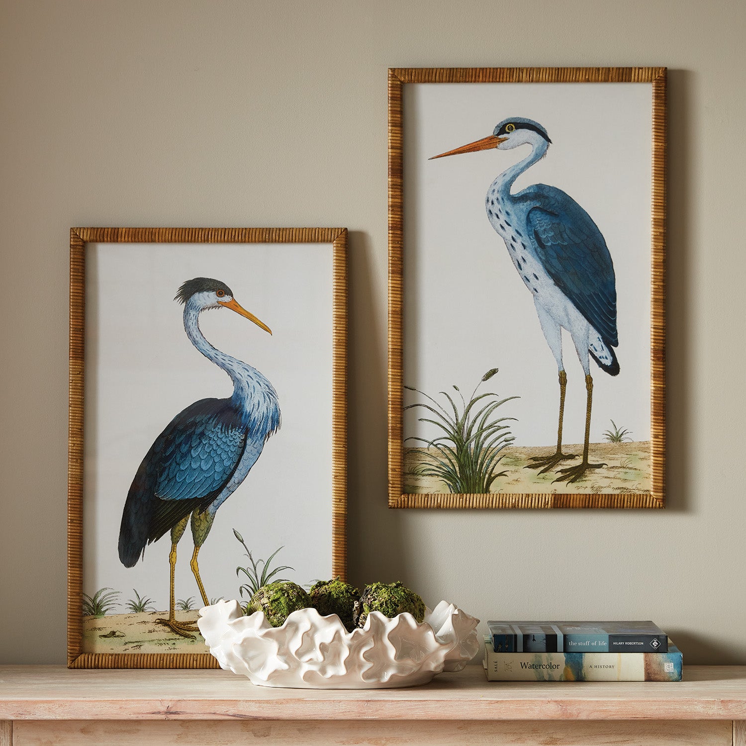 The Blue Heron is one of nature's most regal creatures. This pair is a charming interpretation, a Napa exclusive, produced in a small quantity. Finished off in bamboo-wrapped frames, this pair makes a great addition to beach cottage or villa.